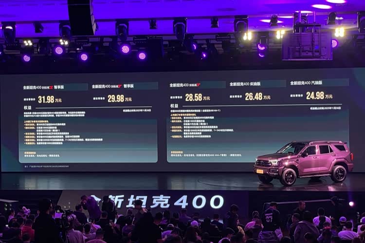 11月6日,全新 坦克400(參數(shù)|詢(xún)價(jià))正式上市,新車(chē)共推出5款車(chē)型,覆蓋了混動(dòng)、燃油和柴油的全動(dòng)力。其中預(yù)售時(shí)推出的Hi4-T智享版與Hi4-Z智享版兩款車(chē)型均比預(yù)售價(jià)降了1萬(wàn)元,售價(jià)分別為29.98萬(wàn)和31.98萬(wàn)元。另外三款車(chē)型全新坦克400 Hi4-T售價(jià)28.58萬(wàn)元、全新坦克400柴油版售價(jià)26.48萬(wàn)元、全新坦克400汽油版則售價(jià)24.98萬(wàn)元。