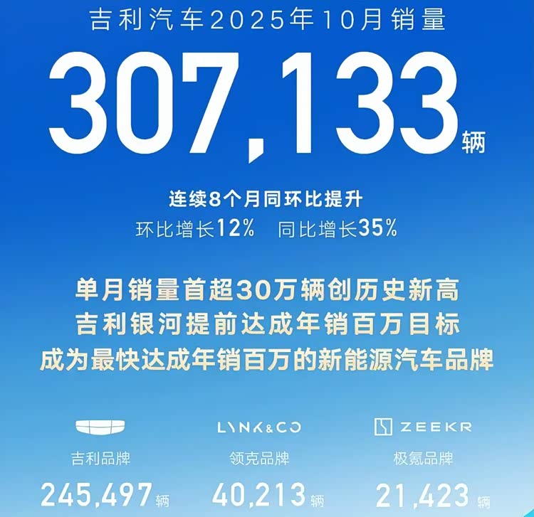 今年前10個月,吉利銀河累計銷量達到100.2萬輛,同比增長187%,成為最快實現年銷百萬的新能源汽車品牌,李書福再創新紀錄。