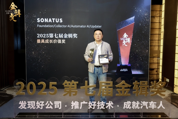 2025年10月30日,由《蓋世汽車》主辦的2025年第七屆“金輯獎”頒獎典禮在上海圓滿落幕。SONATUS公司AI賦能的軟件定義汽車產品在獎項評選中脫穎而出,非常榮幸的獲得了“2025年度最具成長價值獎”。SONATUS中國區總經理任松濤先生受邀出席頒獎典禮,并代表SONATUS公司領取獎項。