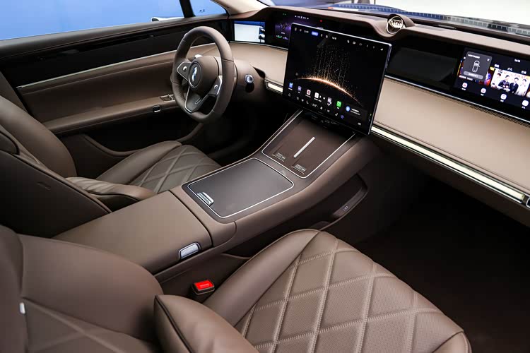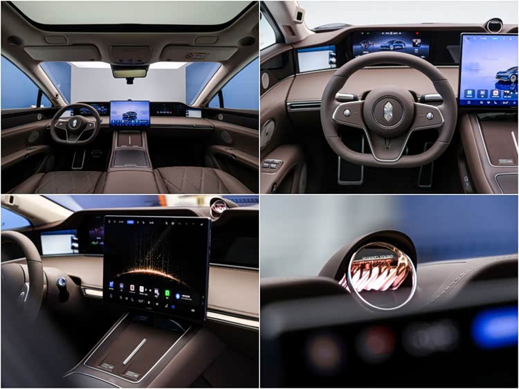 5、 內飾采用和享界S9T一樣的雙峰設計,副駕駛增加了12.3英寸娛樂屏,中控大屏則升級為16.1英寸新屏幕,3K分辨率更細膩。主駕依然是遠端屏設計,盡管方向盤進行了調整,但方向盤還是會稍微擋住儀表屏幕下方的續航里程顯示,好在這個信息不算重要。