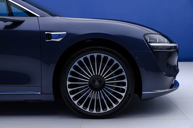 2、 側翼子板上增加了補盲激光雷達,這也是鴻蒙智行9系車型的標準,而且輪轂也有21英寸的密輻式低風阻輪轂。此外也同樣增加了黑耀套件的選擇,除了全黑的飾件之外,還有黑色輪轂和紅色卡鉗,給年輕用戶一個新的選擇。