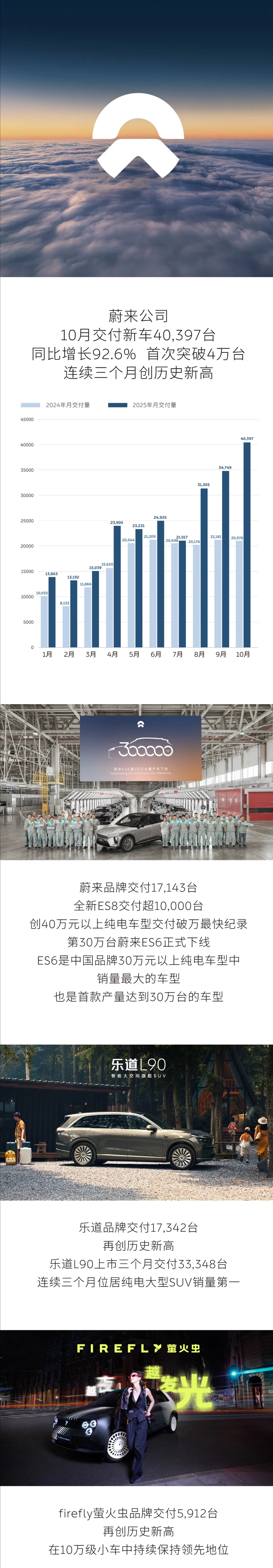 整個 10 月,蔚來單月累計交付新車 4.03 萬輛,實現同比暴增 92.6%,這不僅是蔚來單月交付量的歷史最高紀錄,也是公司首次實現月交付量突破 4 萬輛大關。