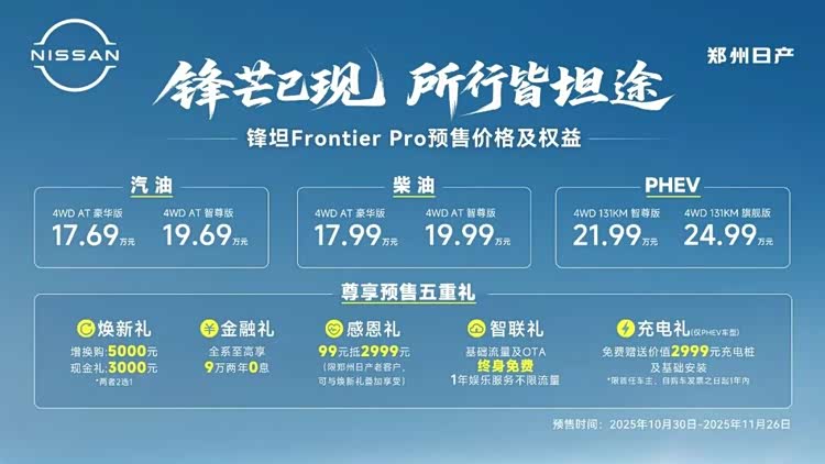 車型名稱很好解釋,“鋒芒已現 所行皆坦途”。那么鄭州日產Frontier Pro正式開啟預售,6款配置可選!預售價格17.69萬-19.99萬元,鋒坦Frontier Pro PHEV,新能源車型的預售價格為,21.99萬-24.99萬元。