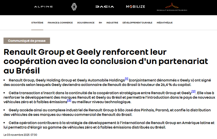近日,據雷諾集團11月3日發布的公告,雷諾集團與吉利控股集團雙方正式簽署巴西戰略合作最終協議,吉利將收購雷諾巴西公司26.4%股權,雷諾集團仍保持控股股東地位并將其納入合并財務報表。