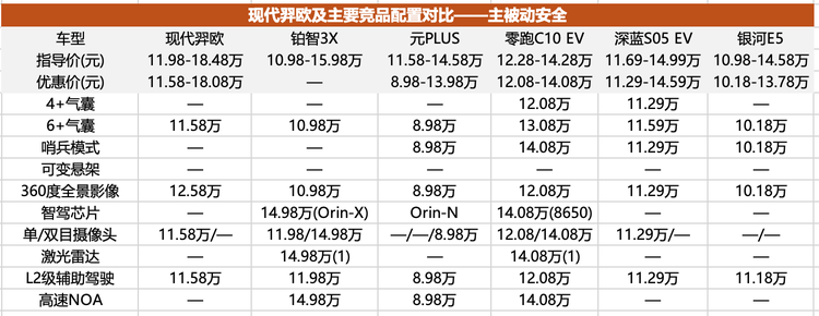 主動安全方面,L2級輔助駕駛在EO羿歐上實現標配,但是自主車型已經普遍配備的哨兵模式,在EO羿歐上沒有出現,同時鉑智3X、零跑C10的高配上配備了激光雷達和高速NOA,EO羿歐也沒有跟進,這方面相對落后。