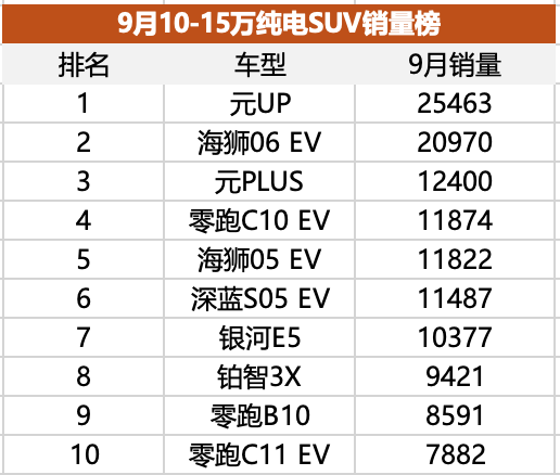 上表是9月份主銷價位在10-15萬元區間的純電SUV銷量榜,鉑智3X在合資純電市場中排第一,但是在總體細分市場中只能勉強排到第八,和元UP、海獅06等2萬輛的爆款差距甚遠。
