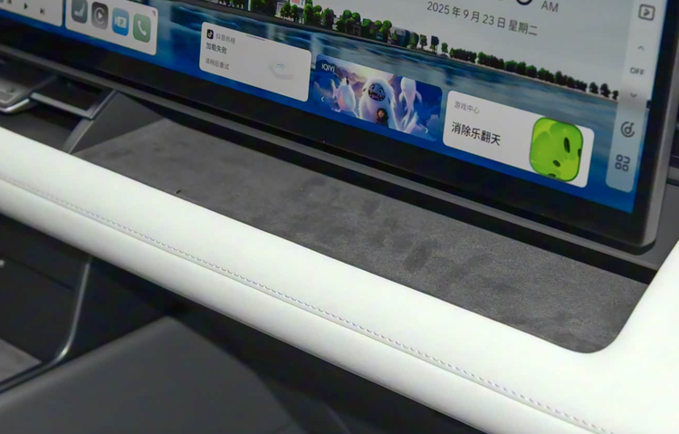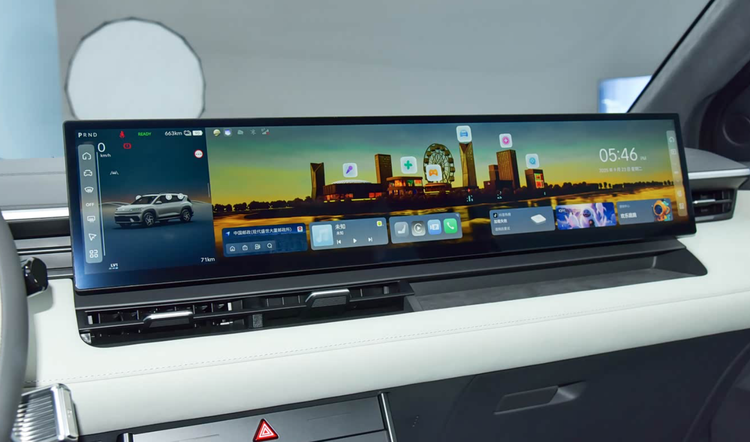 而在座艙智能化方面,EO羿歐帶來了不小的驚喜。中控臺全系標配了一塊27英寸的大屏,布局類似理想的L系列,這個屏幕規格在15萬元以內市場還是相當搶眼的。