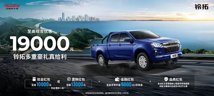 本月購車特別推出三重禮遇:10000元現金紅包或13000元置換補貼,以及價值6000元的2年免息支持,綜合優惠高達19000元。鈴拓以扎實品質與實在價格,讓消費者真正實現“花中檔價格,享高端體驗”。