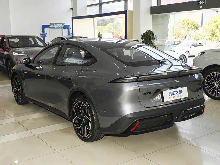 再來看車尾部分,車尾設計與車頭形成完美呼應,層次感極為豐富。貫穿式尾燈橫向拉伸視覺寬度,中央可發光的深藍汽車車標點亮后,夜晚行車時宛如 “光帶環抱車尾”,辨識度拉滿。最大亮點是多擋可調電動升降后擾流板,高速行駛時自動升起可提供下壓力,讓車身更貼地穩定,低速時則隱藏保持優雅,也可通過中控手動控制切換姿態。后包圍處的熏黑大尺寸擴散器與尾翼呼應,不僅優化了空氣動力學性能,更讓尾部的戰斗感直線升級,徹底顛覆了家用轎車的沉悶形象。
