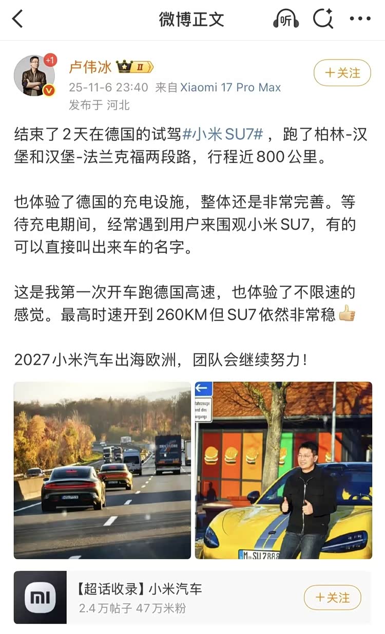 車家號·0瀏覽·2025-11-07 17:35 · 北京11月6日,小米集團(tuán)總裁盧偉冰發(fā)微博稱,自己結(jié)束了2天在德國的 小米SU7(參數(shù)|詢價)試駕,行程近800公里,旗艦還體驗了德國的充電設(shè)施,整體非常完善,小米SU7還經(jīng)常遇到用戶圍觀。盧偉冰表示,“這是我第一次開車跑德國高速,也體驗了不限速的感覺。最高時速開到260km但SU7依然非常穩(wěn)”。盧偉冰還透露,2027年小米汽車將出海歐洲市場。