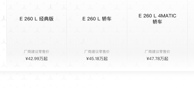 日前,筆者從梅賽德斯-奔馳官網(wǎng)獲悉,2026款奔馳長軸距E級(下稱:2026款 奔馳E級(參數(shù)|詢價(jià)))現(xiàn)已正式上市,官方指導(dǎo)價(jià)42.99萬元起。作為年度改款車型,2026款奔馳E級的功能配置得到改進(jìn)升級,新增E 260 L經(jīng)典版作為全新入門車型。