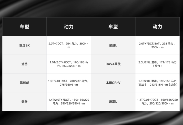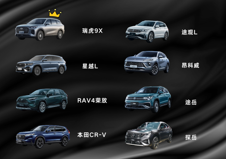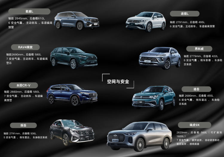 綜合來看,途岳勝在品牌認知,星越L贏在智能設計,RAV4榮放等合資車型靠品牌口碑,探岳、途觀L主打德系品質——每款車都有明確的受眾!而瑞虎9X的優勢在于“全能均衡”。2.0T動力滿足性能需求,高階智駕和豪華內飾提升科技體驗,大空間+全安全配置契合家庭使用。