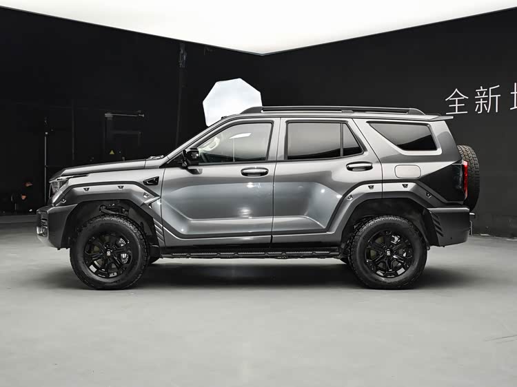 側面造型方面,車頂線條比較平直,配備有粗壯的行李架,有著比較強的力量感,傾斜的C柱也是很有辨識度的設計,有效增加了硬派氣息;腰線采用了分段式設計,點綴出了車身側面的層次感;輪眉和側裙部分設計有粗壯的飾板,進一步增強了力量感;輪轂采用了多幅式熏黑造型,同樣是野性十足的風格。