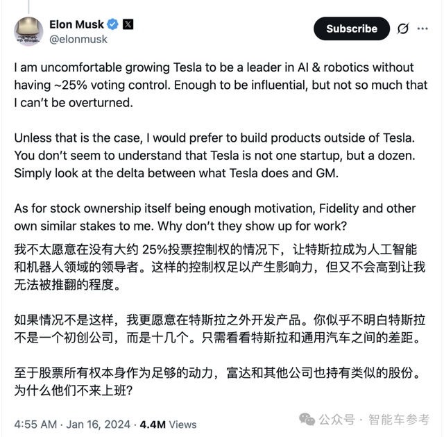同時他們認為方案設計也存在漏洞,缺乏有效的約束調整機制,更多股權——也可以理解為控制權——交到馬斯克手里,可能會導致公司對馬斯克個人的過度依賴。