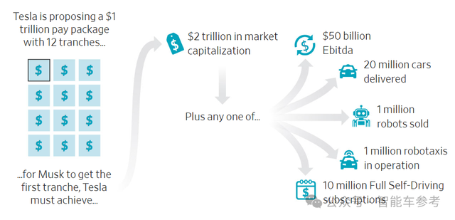 - 市值,最高需要翻8倍到8.5萬億美元(約60.6萬億元),超越現在的全球股王英偉達。市值解鎖門檻最低2萬億美元,還要同時達到一個利潤或銷售目標,才能解鎖一批股票發放。