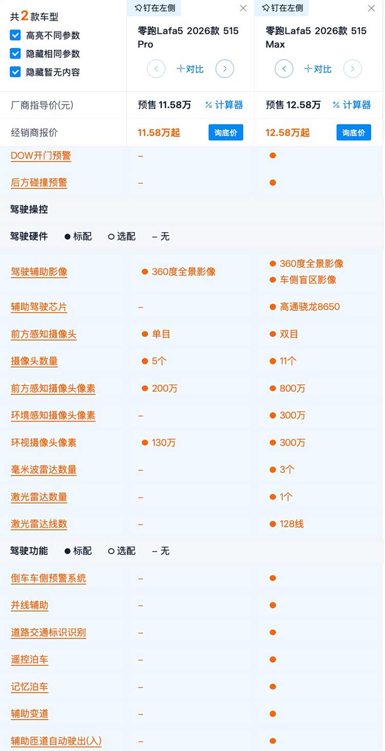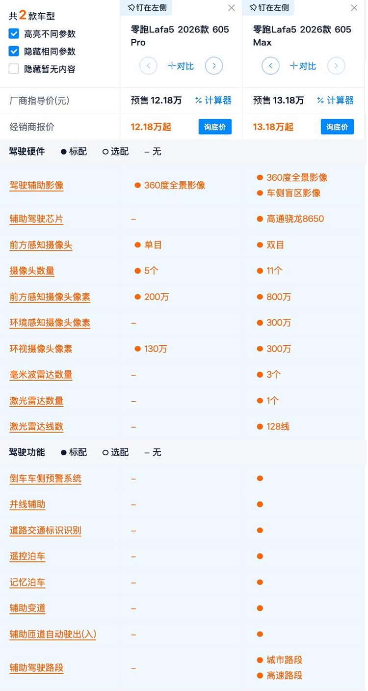 價格來看,這兩臺車的差價依然是1萬元,而Max版比Pro版多出的主要配置就是一顆128線的激光雷達。