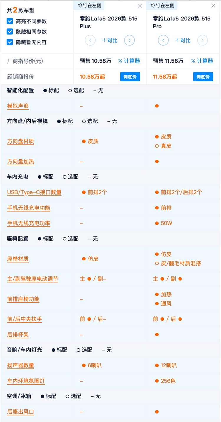 除此之外,Pro版還多出了前后頭部氣囊、電動后備箱、全景天窗、外后視鏡調節、折疊、座椅加熱/通風、前排50W手機無線充蒂娜、方向盤加熱、后排中央扶手、后排杯架、后排出風口等,再來看差價,515 Plus版預售價10.58萬,515Pro預售價11.58萬,只相差1萬元,這樣來看Pro版顯然更加合適。