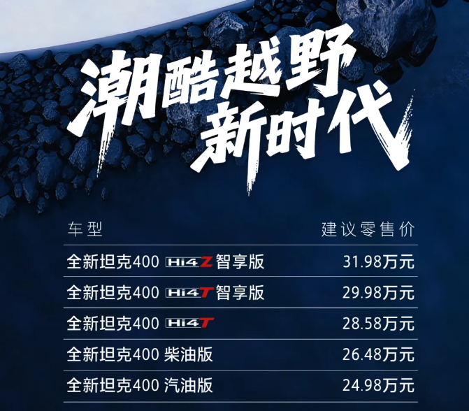 大家好,我是隔壁老王,今兒得好好嘮嘮剛上市的全新 坦克400(參數(shù)|詢價(jià)),24.98萬起的定價(jià)直接瞄準(zhǔn)方程豹豹5,還帶Hi4-T硬派越野、Hi4-Z泛越野雙動(dòng)力選擇,新增敦煌紫潮酷配色和激光雷達(dá),2850mm軸距加滿配舒適配置,要在25-35萬硬派SUV市場(chǎng)跟豹5正面掰手腕,不管是沖越野去的硬核玩家,還是想兼顧家用的年輕人,這下都有了更實(shí)在的選擇。