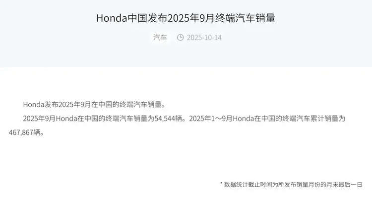 另據本田中國10月14日發(fā)布的數據顯示,2025年9月本田在中國的終端汽車銷量為54544輛。2025年1月至9月,本田在中國的終端汽車累計銷量達467867輛。從同比數據來看,今年9月銷量較2024年同期下降13%,而1-9月累計銷量同比下降20.45%,反映出市場面臨的挑戰(zhàn)。雖然環(huán)比8月的53339輛增長2.2%,體現出了傳統(tǒng)"金九"銷售旺季的提振作用,但增長幅度相對有限,表明市場復蘇力度仍待加強。