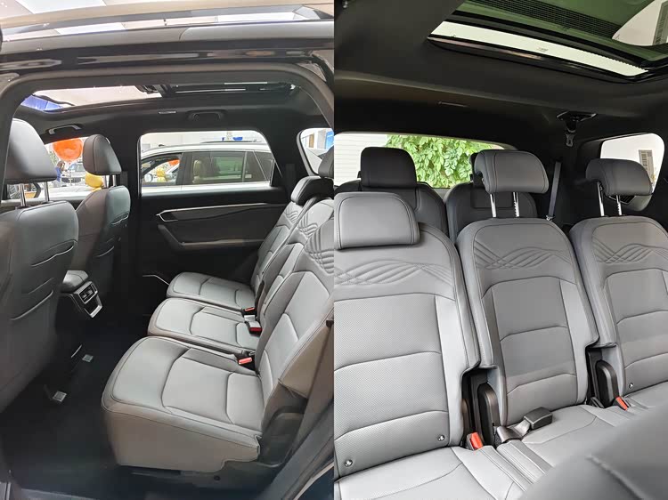 座椅布局這次玩出花了,5座6座7座全都有,覆蓋人群一下就廣了。大五座版本后備廂空間628升,平時就兩口子或者三口之家用車,這個空間夠裝,不用像7座那樣為了多兩個座椅犧牲儲物能力。6座版本2加2加2布局適合二胎家庭,中間通道方便進出第三排。7座版本2加3加2最大化乘坐人數,二三排還能純平放倒,偶爾拉貨也方便。這三種布局基本把家用場景全覆蓋了。