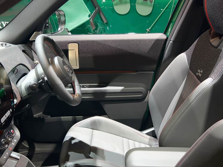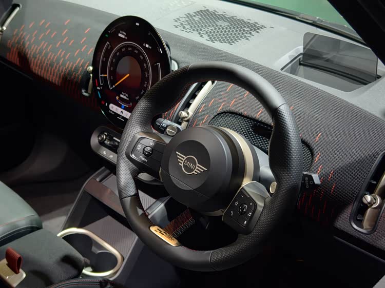 車內(nèi)還是延續(xù)了MINI的圓形標(biāo)志性元素,出風(fēng)口改為了豎狀的圓角條形設(shè)計(jì),也保留了有大量的撥桿設(shè)計(jì)。中控屏幕依然是薄型的圓形大屏,簡(jiǎn)單體驗(yàn)了下,只能說(shuō)和MINI純電一樣,反應(yīng)速度不快、延遲比較明顯。這次新車取消了橢圓形液晶儀表,而是改用前IP臺(tái)HUD,只是并非投影在玻璃上,而是有一個(gè)專屬反射片。