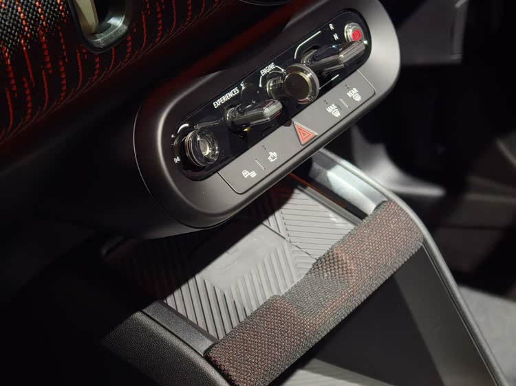 內(nèi)飾細(xì)節(jié)依然精致,大面積的織物覆蓋,JCW版本用了紅色豎狀織線;同時(shí)很多細(xì)節(jié)用了啞光金色飾條勾勒。沒有中央操縱臺(tái)能帶來(lái)更多的橫向空間,采用杯架、儲(chǔ)物格分離設(shè)計(jì),同時(shí)中間有一個(gè)織物的蓋板可以拉起來(lái),情緒價(jià)值拉滿。雖然軸距加大,但后排空間變化不大,一拳三指左右膝部空間,頭部空間一拳左右,坐姿比純電車更加舒服。不過(guò)中央通道有隆起,四人乘坐更合適。另外座椅也可以前后移動(dòng)來(lái)擴(kuò)大后備箱空間,靠背有兩檔調(diào)節(jié)。