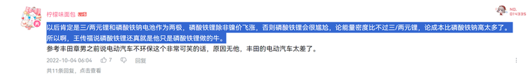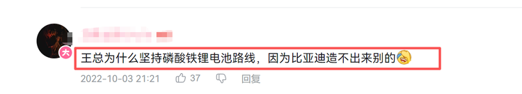 前段時間理想出了自燃事件,當時很多人就在說“磷酸鐵鋰天下無敵”,相比之下三元鋰的聲量現在小得可憐。但其實磷酸鐵鋰的輿論場不是一直就這樣的,早在 2021 年,王傳福就在某個演講中說:電動車一定要堅持磷酸鐵鋰的方向,但彼時的評論區充滿著陰陽怪氣地嘲諷。