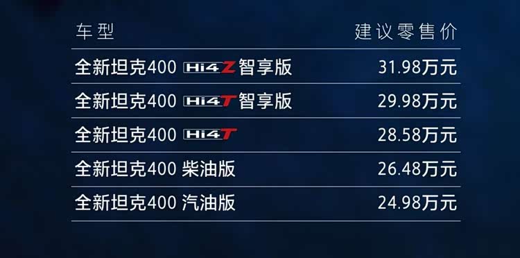 全新坦克400的售價正式公布了,動力十分多樣化,汽油版24.98萬元、柴油版26.48萬元、Hi4-T版28.58萬元、Hi4-T智享版29.98萬元、Hi4-Z智享版31.98萬元,同時可享3000元訂金抵6000元購車尾款,3000元遠紅外夜視系統選裝基金、5年免費道路救援、免費選敦煌紫配色等購車福利。