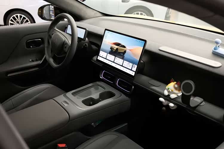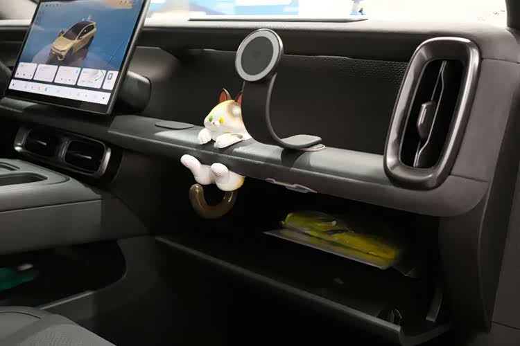 內飾布局和零跑B01相近,也共用了一些模具設計。副駕扶手箱處采用了小平臺設計,有一些展示用的小掛件和手機支架,沒有看到B01的折疊小桌板。車內用料精致度尚可,座椅和扶手處采用了一些高摩擦力材料來提升運動氛圍(皮質/翻毛材質座椅需選裝)。
