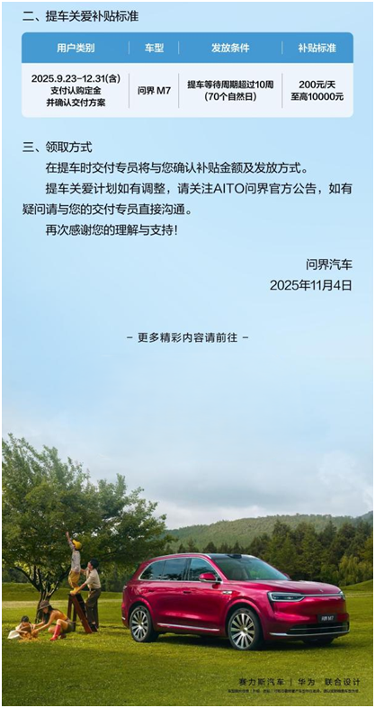 此次計劃為在2025年9月23日至12月31日期間支付定金并確認交付方案的用戶提供了切實保障。官方提出:當用戶在鴻蒙智行或AITO APP上的訂單狀態從【交付方案已確認】變更為【車輛已到店】時,如果實際等待天數超過了70個自然日(10周),可按實際超期天數領取每日200元的提車關愛補貼,累計補貼金額至高10000元,具體的補貼金額與領取方式將在用戶提車時,由用戶中心的交付專員進行一對一確認和落實。