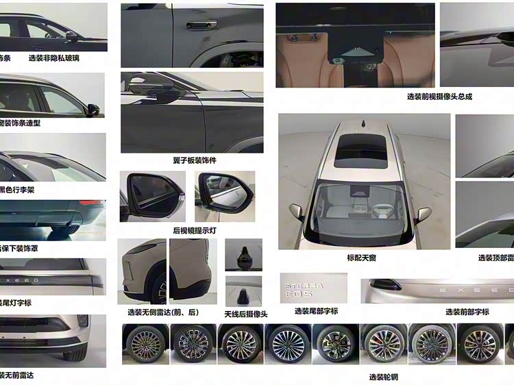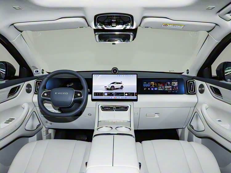 外觀設計融合東方美學,采用圓潤飽滿的線條,前臉分體式大燈組搭配中央“EXEED”英文標識,尾燈為貫穿式設計(與前臉呼應),車身尺寸為長4780毫米、寬1890毫米、高1725毫米,軸距2800毫米(后排空間寬敞,1米8乘客可翹腳)。內飾采用灰白混色設計,配備雙輻多功能方向盤(集成觸控按鍵/滾輪)、懷擋式換擋機構、中控下方手機無線充電板及對開式扶手箱,兼顧科技感與日常使用便利性