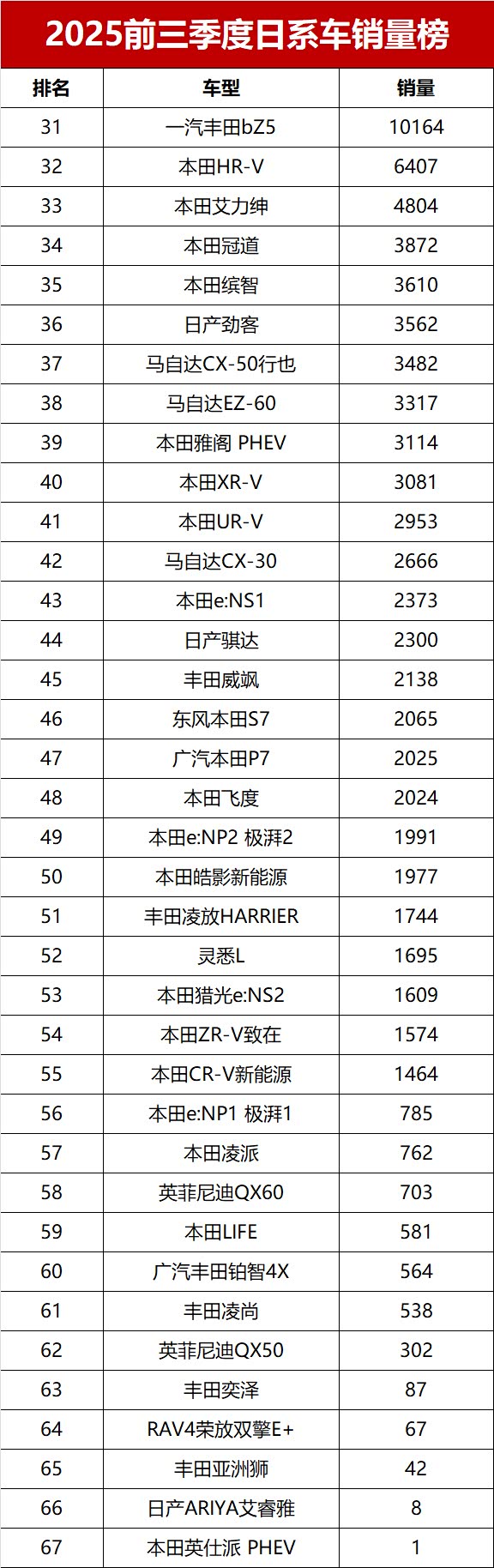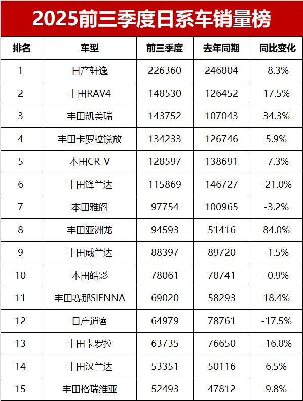 【2025年前三季度日系車批發(fā)銷量排行榜】在自主新能源的強(qiáng)勢沖擊下,日系車在中國市場的銷量持續(xù)承壓。乘聯(lián)會(huì)數(shù)據(jù)顯示,2025年1-9月中國產(chǎn)日系品牌乘用車?yán)塾?jì)批發(fā)銷量204萬輛,同比減少3.8%,延續(xù)了近年來的下滑態(tài)勢。日系品牌傳統(tǒng)優(yōu)勢逐漸弱化,陣營內(nèi)部呈現(xiàn)明顯分化,豐田成為唯一的增長亮點(diǎn),本田、日產(chǎn)則持續(xù)深陷下滑泥潭。有點(diǎn)慘!前三季度日系車銷量榜,六款車超10萬輛, 卡羅拉(參數(shù)|詢價(jià))未進(jìn)前十!