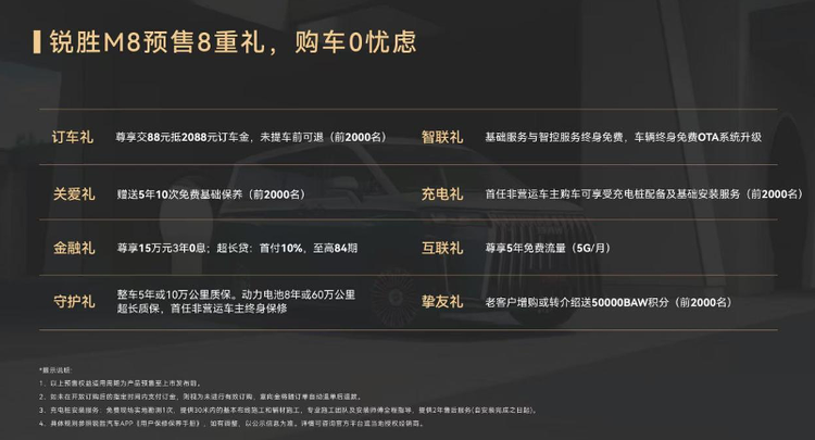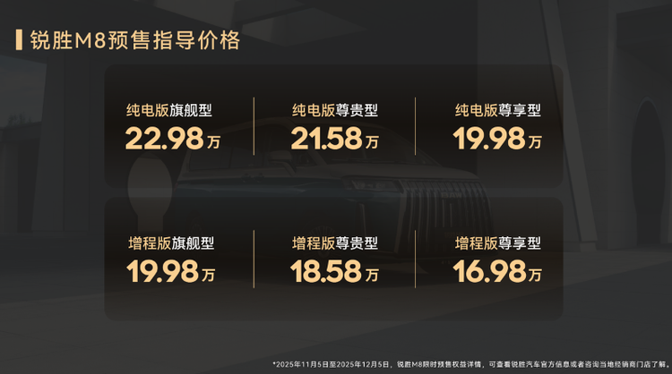 銳勝M8精心打造多種動力版本,為消費者提供多樣化選擇。其預售價格如下:銳勝M8 - 增程版起始售價為169,800元,銳勝M8 - EV版起始售價為199,800元。