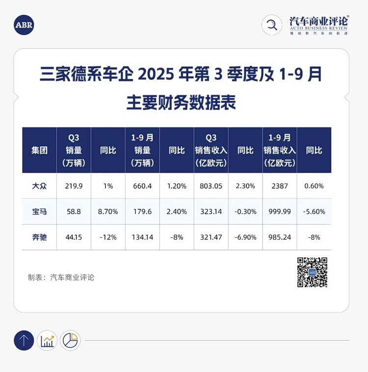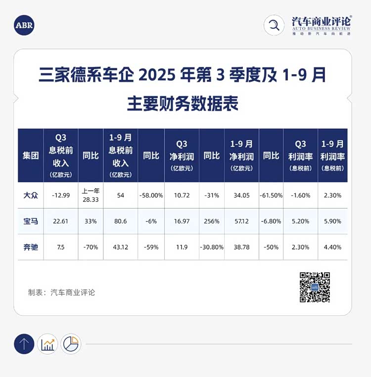 以下是《汽車商業評論》整理的三家德系車企2025年第三季度以及1-9月的整體業績。