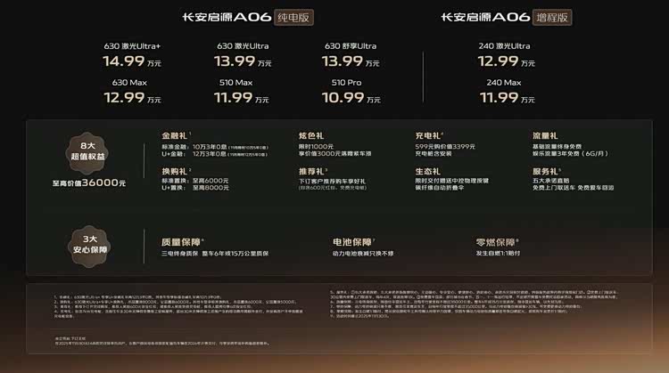 動力方面,長安啟源A06提供純電和增程兩套動力系統,其中,純電版提供兩種規格的驅動電機,高功率車型最大功率為210千瓦,低功率車型最大功率為120千瓦。電池匹配51.48千瓦時和63.18千瓦時兩種容量的磷酸鐵鋰電池,對應CLTC續航里程為510公里和630公里。